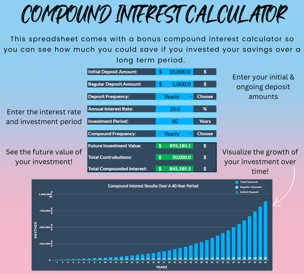 This purchase is bundled with a compound interest calculator so you can project the growth and future value of your money over time!