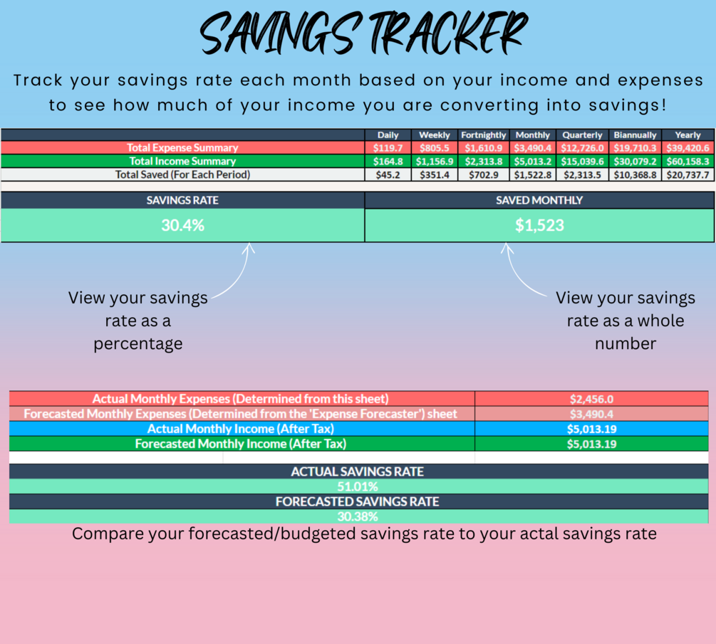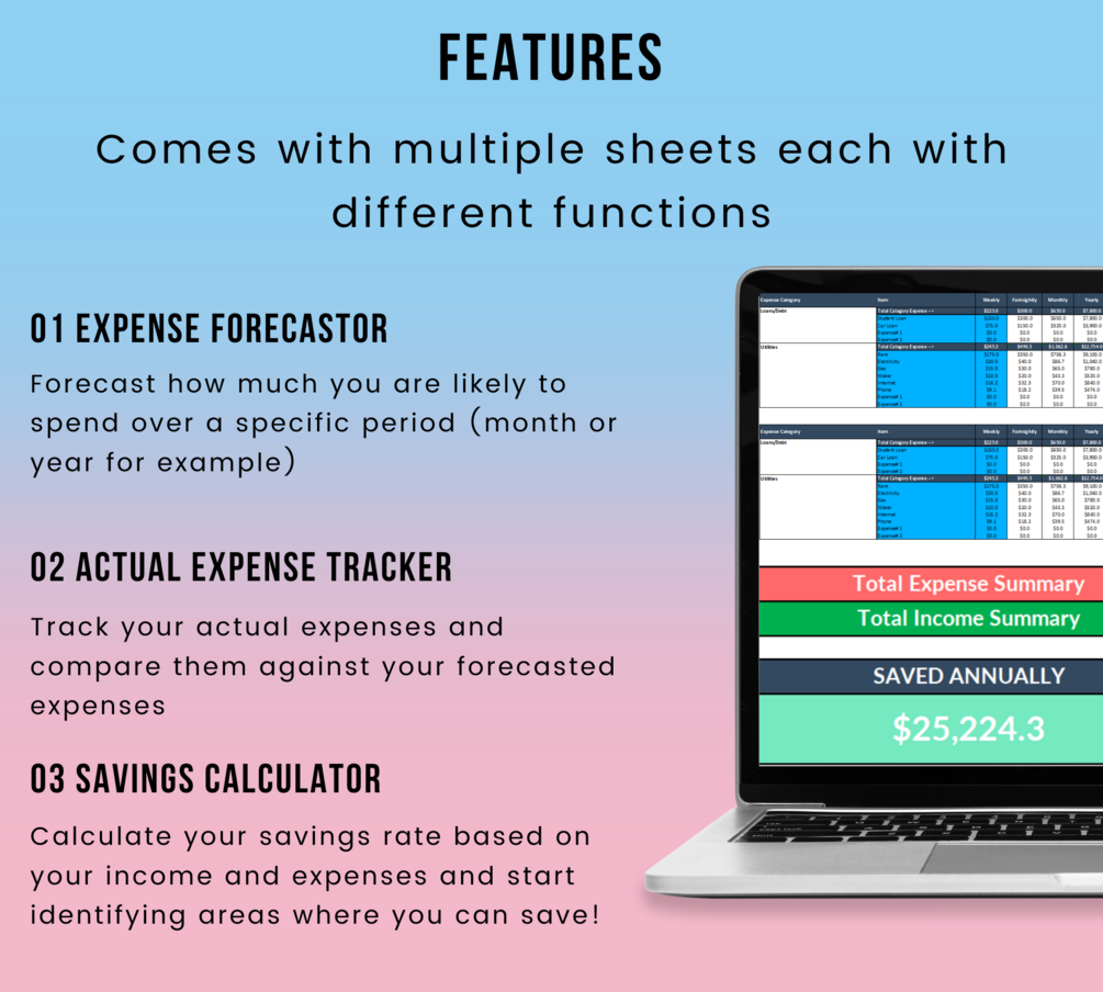 The spreadsheet includes an 'Expense Forecaster' that gives you the flexibility to define daily, weekly, fortnightly, monthly or yearly expenses, ensuring you can accurately capture all of your expense types without needing to perform your own calculations.