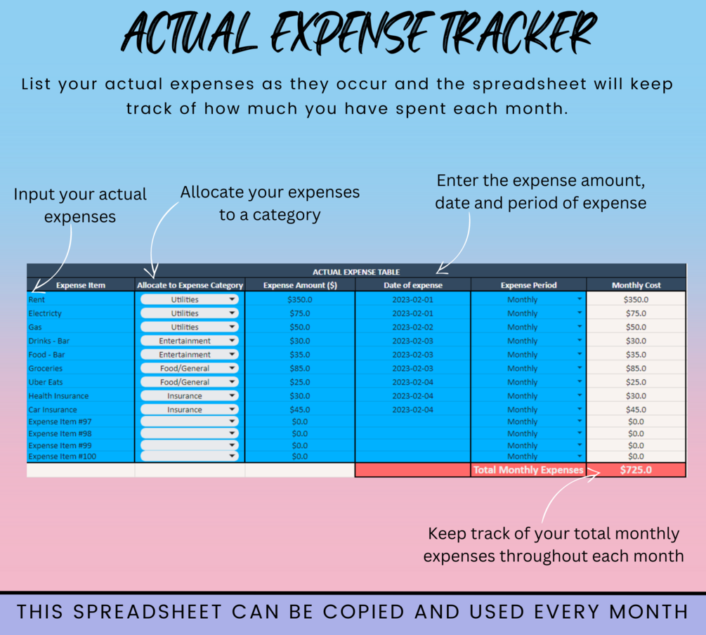 ✔︎ This template can be used multiple times, making it the perfect monthly budget tracker - simply make a new copy for each month!